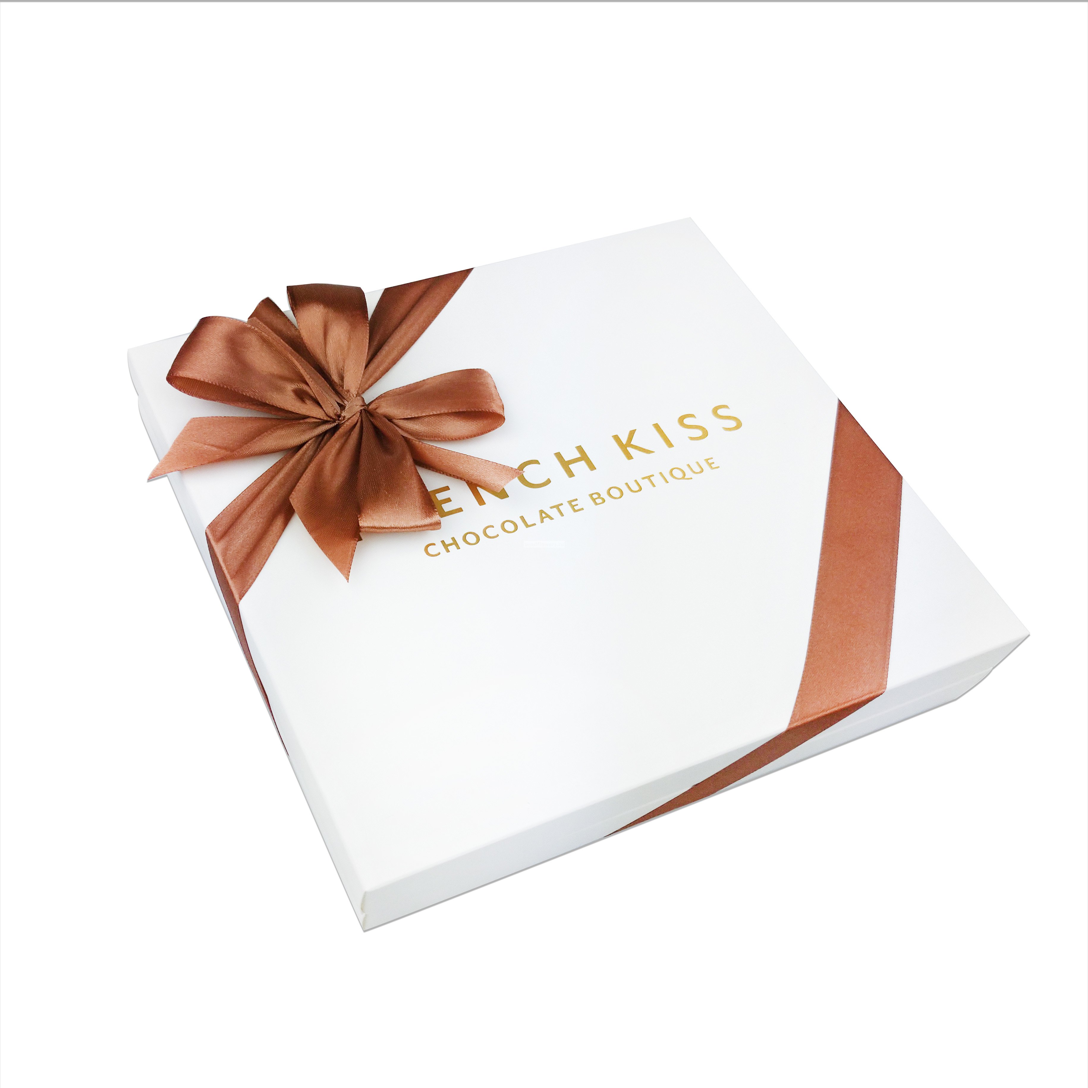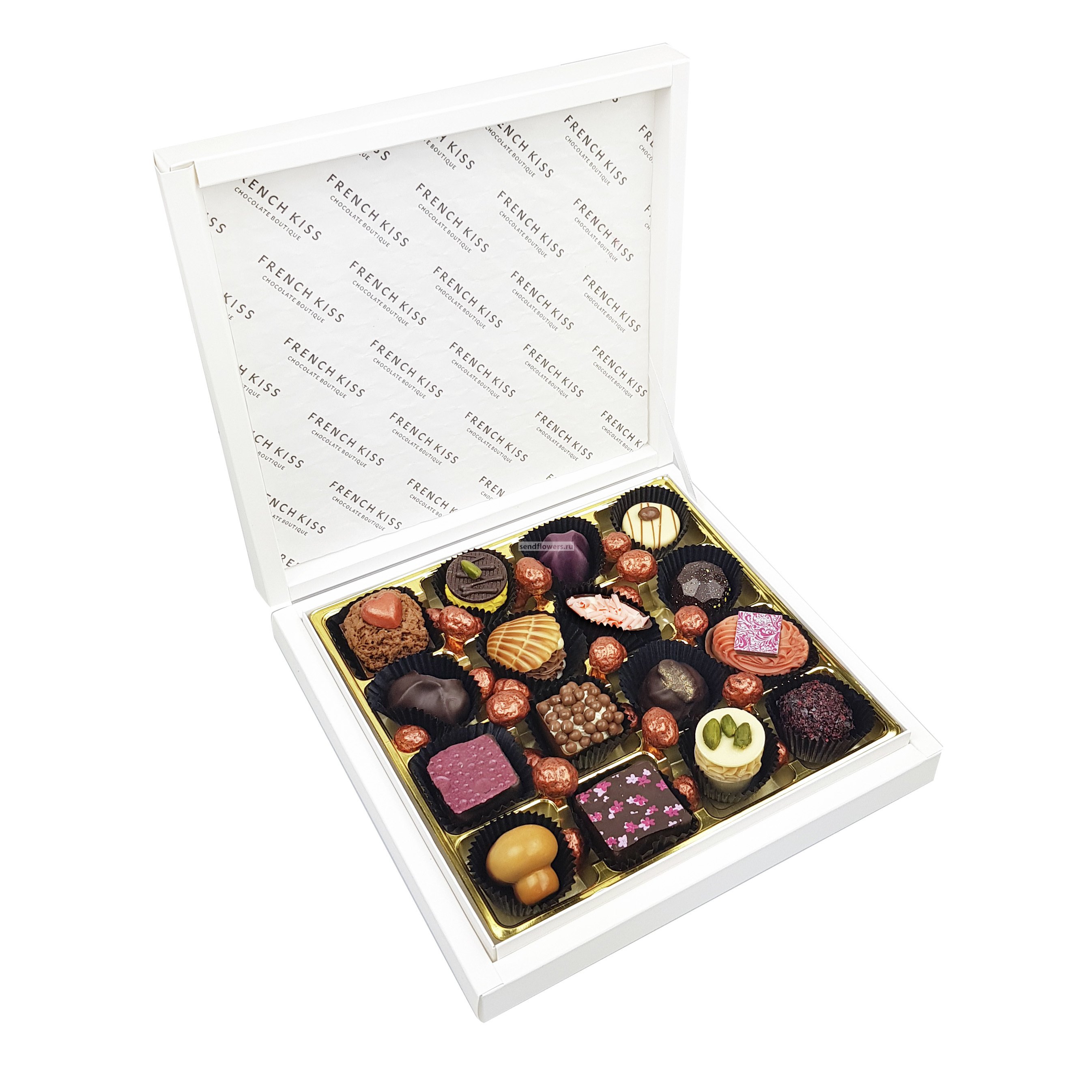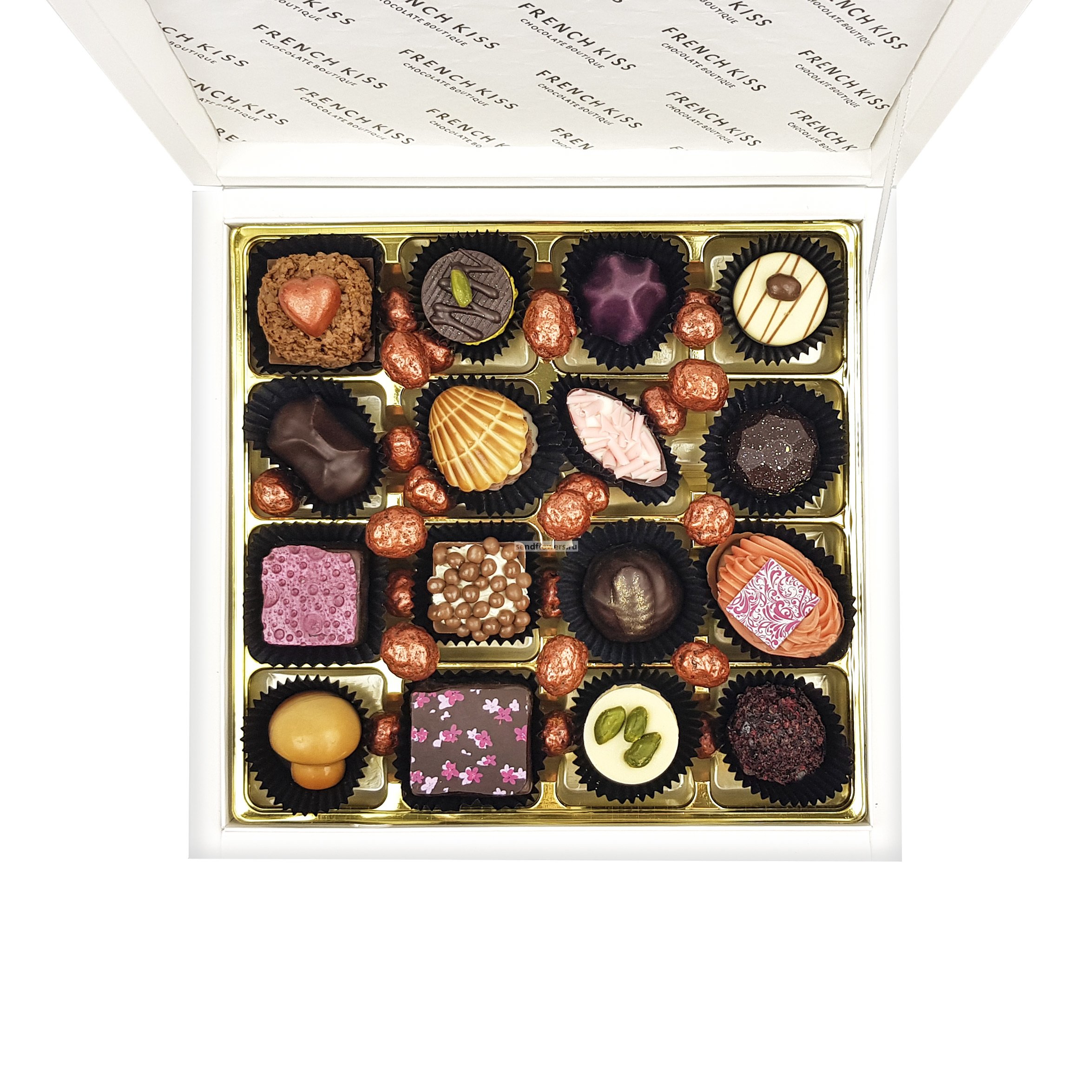 Ассорти конфет из 16 штук, общим весом 0,295 кг, ассорти драже - 0,050 кг. Коробка белая, размером 22*23*4,5 см.